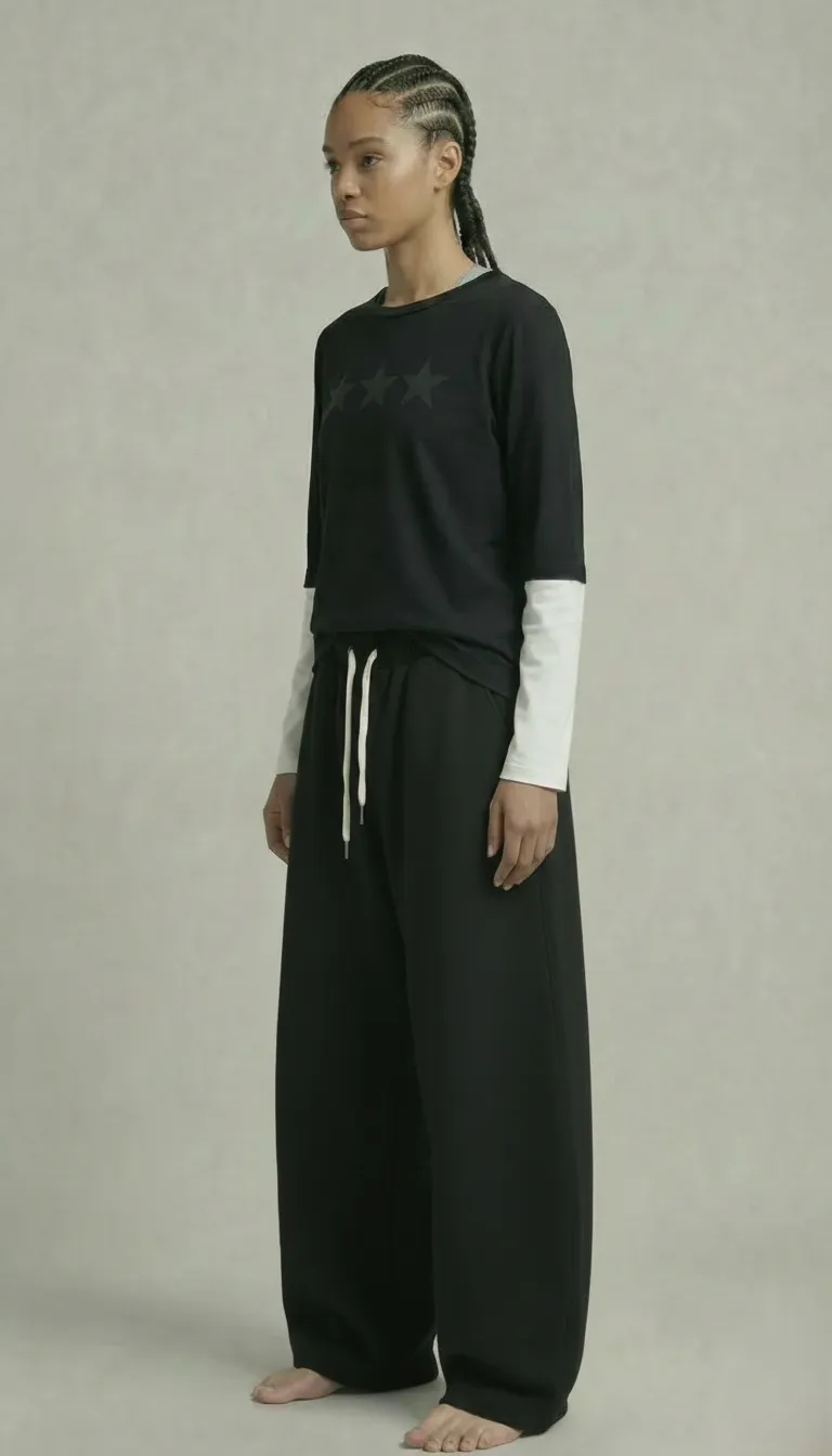 The complete “All Black” uniform. This set is designed to work in harmony, pairing the structured cropped tee with the high-volume balloon pants to create a striking, futuristic silhouette.